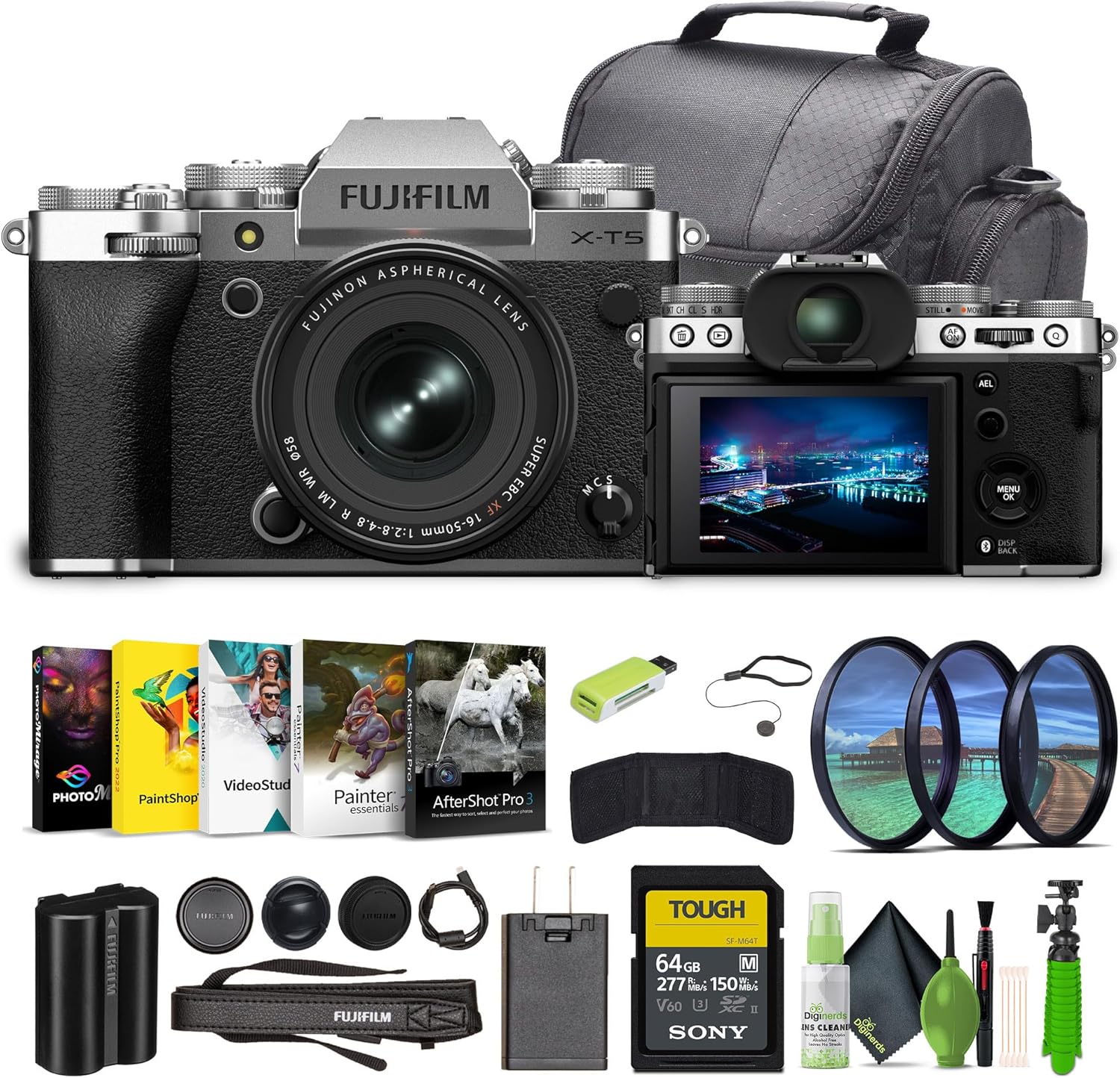 - Bundle Includes: FUJIFILM X-T5 Mirrorless Camera with XF 16-50mm f/2.8-4.8 Lens (Silver) + 64GB SF-M Tough Series UHS-II SDXC Memory Card + Travel Bag + Cleaning kit + Lens Cap Keeper + 12 inch Flexible Vlogging Tripod + Memory Card Wallet + USB Card Reader, SD/microSD + Corel Photo, Video, & Art Suite Deluxe + Professional 3 Piece Filter Kit, 58mm